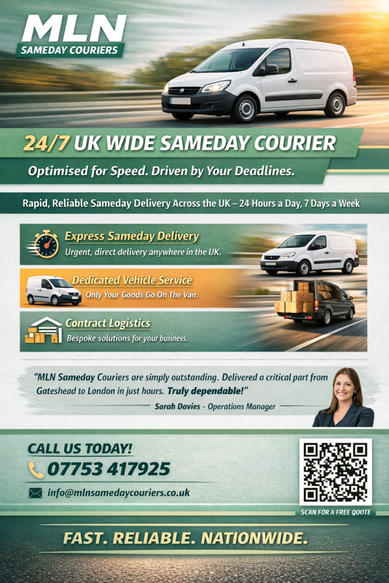 Welcome to MLN Sameday Couriers, where every delivery is a promise kept. From our base in Gateshead, we provide reliable, 24/7 sameday delivery across the UK. Discover how our commitment to exceptional service and efficiency makes us the trusted partner for your critical shipments.